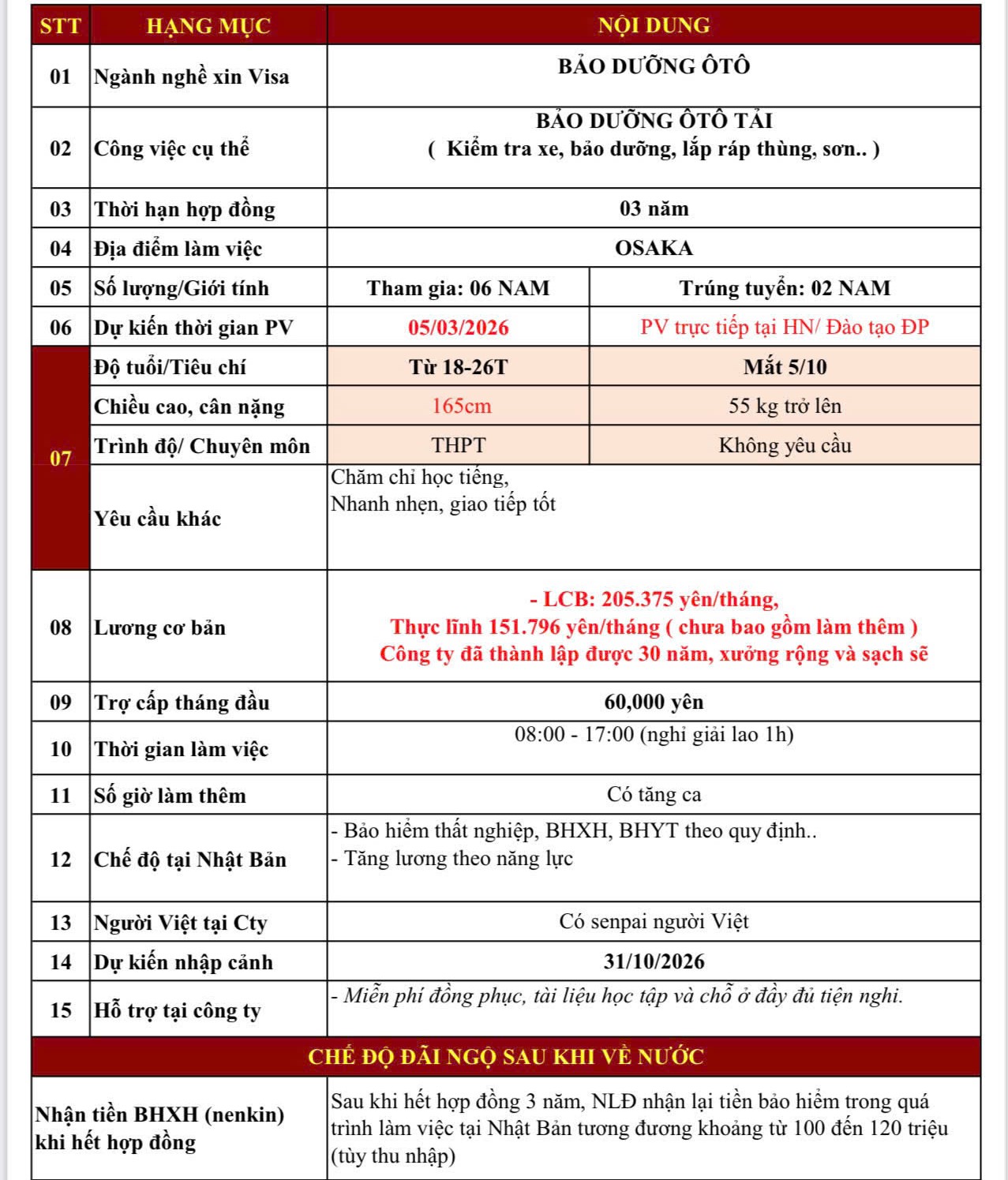 THÔNG BÁO ĐƠN HÀNG ĐI LÀM VIỆC TẠI NHẬT BẢN - ĐƠN HÀNG BẢO DƯỠNG Ô TÔ