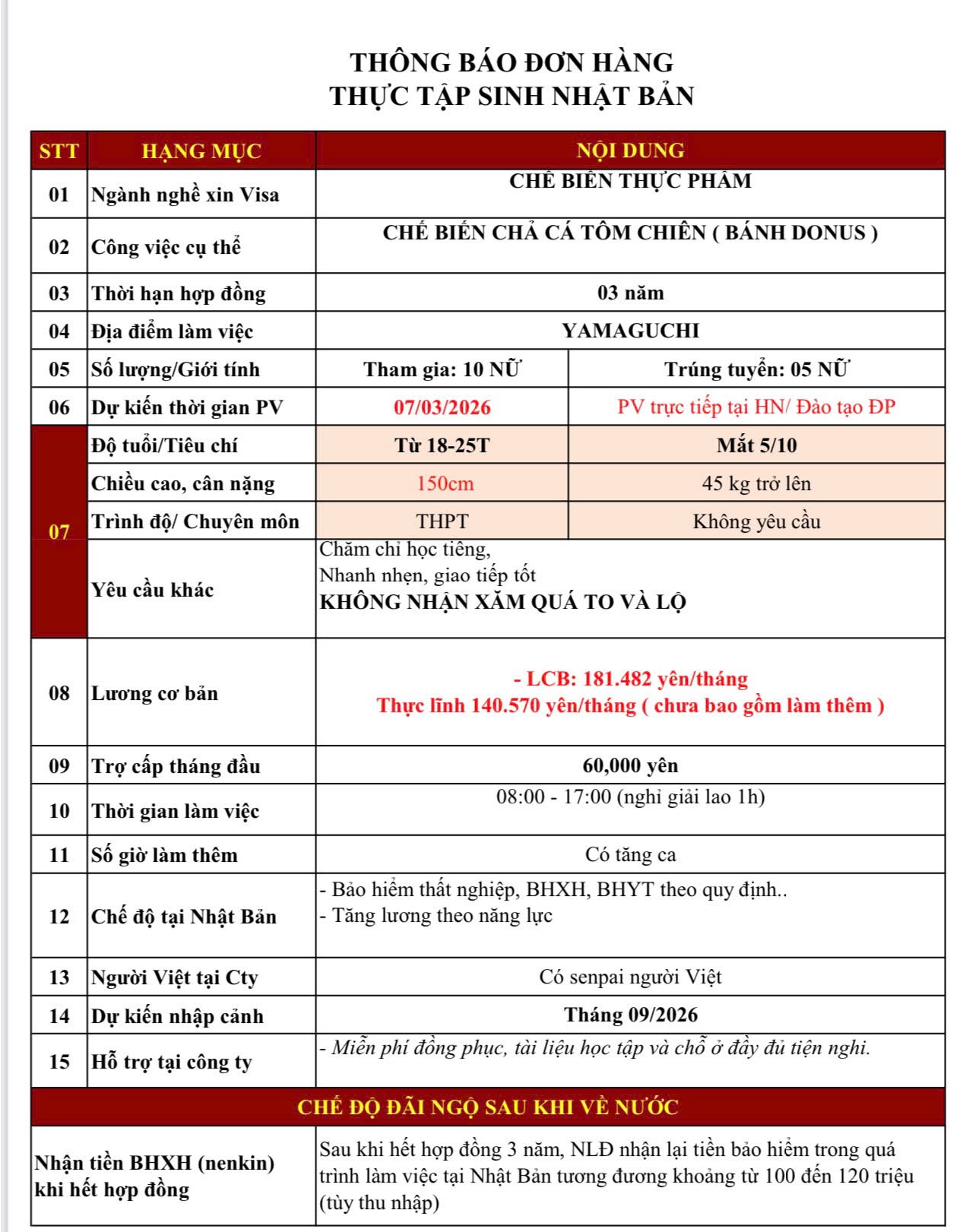 THÔNG BÁO ĐƠN HÀNG THỰC TẬP SINH NHẬT BẢN - CHẾ BIẾN THỰC PHẨM