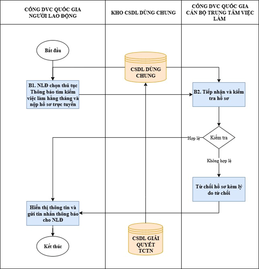 Bước 2: Cổng Dịch vụ công quốc gia chuyển hồ sơ sang Trung tâm Dịch vụ việc làm để tiếp nhận, kiểm tra hồ sơ. Trong quá trình xử lý nghiệp vụ sẽ gọi sang CSDL dùng chung để xử lý hồ sơ.