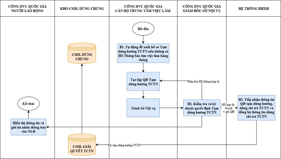 - Trường hợp hồ sơ hợp lệ, Giám đốc Sở Nội vụ duyệt ký quyết định tạm dừng hưởng trợ cấp thất nghiệp. Cổng Dịch vụ công quốc gia gửi 01 bản quyết định tạm dừng hưởng trợ cấp thất nghiệp sang cơ quan BHXH để tạm dừng chi trả trợ cấp thất nghiệp, 01 bản gửi cho người lao động. Thông báo sẽ được hiển thị cho người lao động (trên Cổng và gửi SMS).
