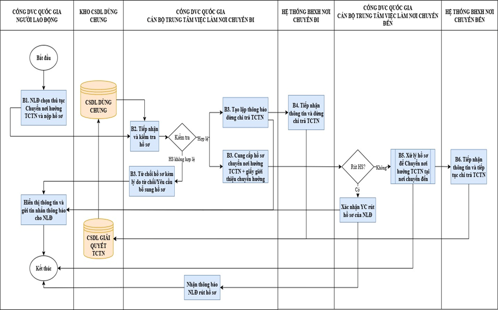 Bước 6: Thông báo về việc tiếp tục chi trả trợ cấp thất nghiệp của người lao động được chuyển đến cơ quan BHXH nơi chuyển đến. Cơ quan BHXH nơi chuyển đến tiếp nhận thông tin Thông báo để tiếp tục chi trả trợ cấp thất nghiệp và cấp thẻ bảo hiểm y tế cho người lao động. Việc thực hiện chi trả trợ cấp thất nghiệp bằng hình thức trực tiếp hoặc trực tuyến cho người lao động thông qua tài khoản ngân hàng người lao động đã nhập thông tin, kết quả thanh toán thành công thì cơ quan BHXH sẽ gửi lại thông tin thanh toán (Số tiền, thời gian, trạng thái, ...) về hệ thống Cổng Dịch vụ công quốc gia để theo dõi và giám sát.